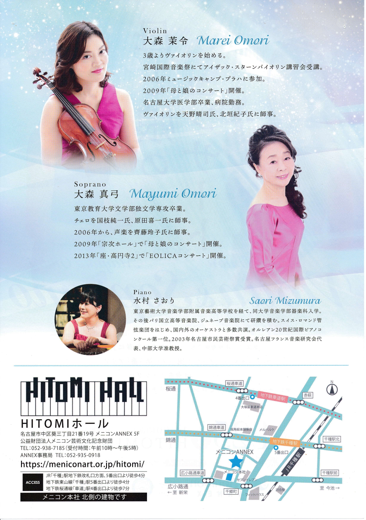 【出演】 大森茉令(ヴァイオリン) 大森真弓(ソプラノ) 木村さおり(ピアノ)